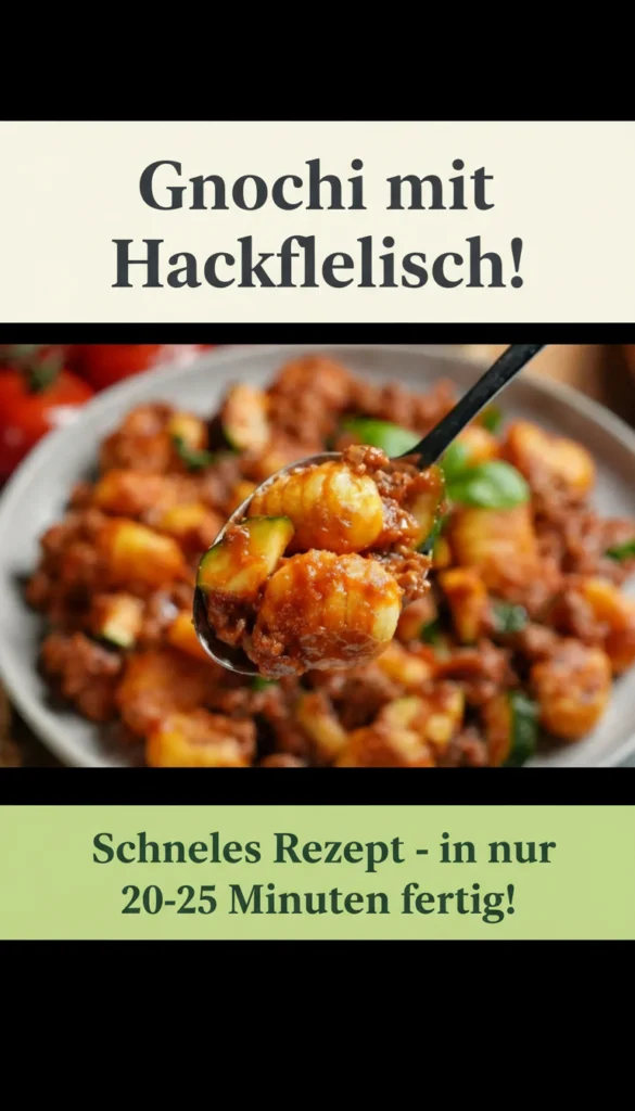 Die Kombination aus zarten Kartoffelgnocchi und kräftigem Rinderhackfleisch sorgt für ein ausgewogenes, sättigendes Gericht. Durch das separate Anbraten der Gnocchi bekommen sie eine schöne goldbraune Kruste, während die Soße angenehm saftig bleibt. Frisches Basilikum und Zucchini bringen zusätzlich Frische und Leichtigkeit auf den Teller.