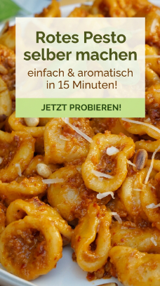 Rotes Pesto passt hervorragend zu Orecchiette, Penne oder Spaghetti. Mit etwas Nudelwasser vermischt entsteht eine cremige, aromatische Sauce, die sich perfekt mit der Pasta verbindet.